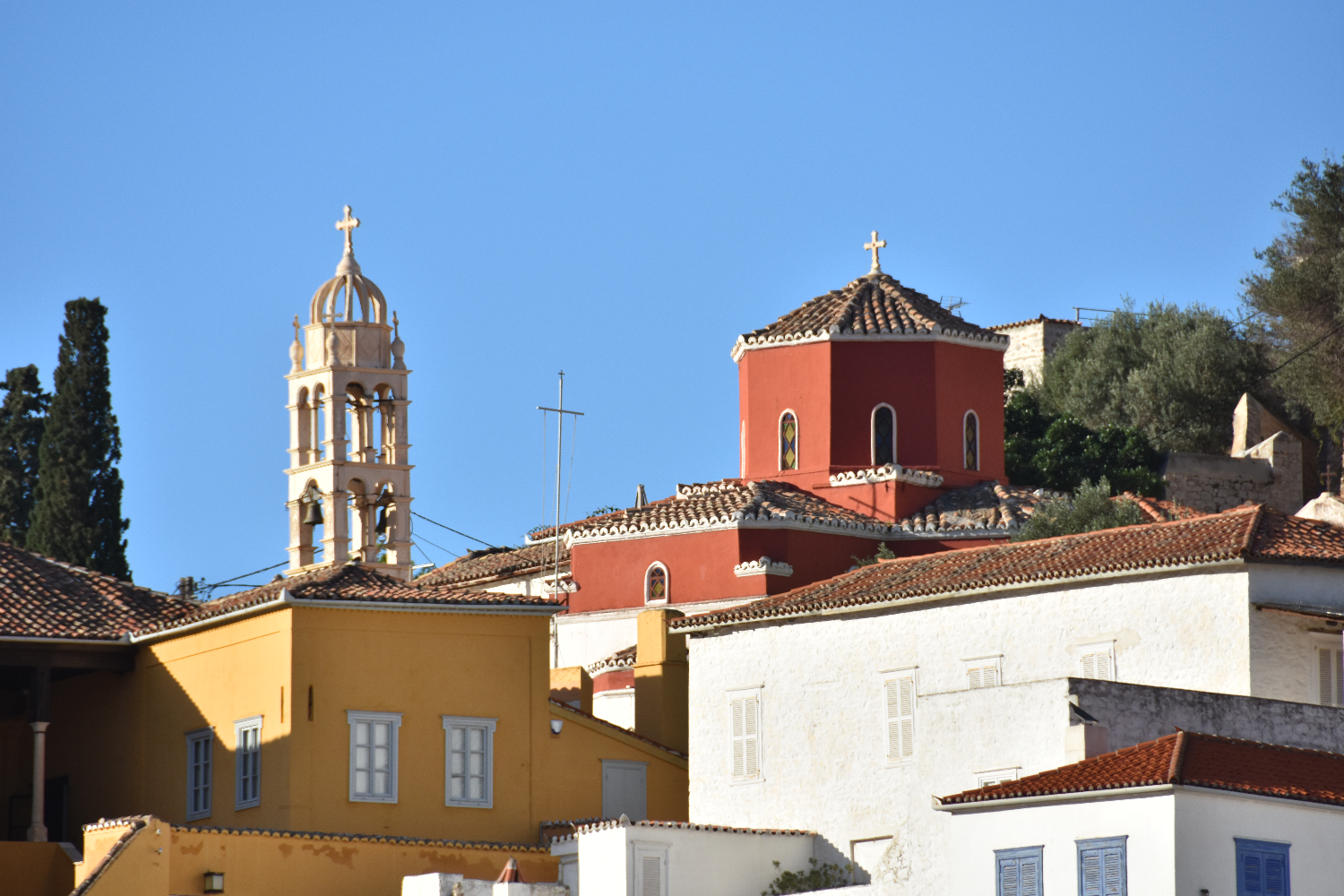 Θα ξεκινήσουμε την περιήγησή μας στην Ύδρα από το κέντρο του λιμανιού, που δεσπόζει το Μοναστήρι, με τον Καθεδρικό Ναό Κοιμήσεως της Θεοτόκου, τη Μητρόπολη του νησιού, και το Εκκλησιαστικό Μουσείο. Το καθολικό της μονής, όπου πολλές φορές συνάχθηκαν οι θρυλικοί ναυμάχοι για να ευχαριστήσουν την Παναγία, σήμερα αποτελεί τον ενοριακό ναό της Ύδρας. Η εκκλησία είναι τρίκλιτη βασιλική με τρούλο, κτισμένη τον 17ο αι. και ανακατασκευασμένη στα τέλη του 18ου. Οι εικόνες της Παναγίας και του Χριστού θεωρούνται θαυματουργές. Εντυπωσιακό είναι το μαρμάρινο τέμπλο καθώς και ο πλούσιος εσωτερικός διάκοσμος του Ναού, όπως επίσης τα δύο μαρμάρινα καμπαναριά της Μονής, το ένα εκ των οποίων διαθέτει ρολόι. Ο ναός φωτίζεται από πολυελαίους, δύο ασημένιους και έναν χρυσό εξάφωτο που έχει επάνω του τις κεφαλές των Λουδοβίκων της Γαλλίας. Λέγεται ότι τον χρυσό πολυέλαιο τον πήρε ο Παύλος Κουντουριώτης από τον πλοίαρχο Σαρκώση, που με τη σειρά του τον είχε πάρει από τις Βερσαλλίες. Στο προαύλιο θα δούμε προτομές του Λάζαρου Κουντουριώτη, του Ανδρέα Μιαούλη, του Βασιλέως Γεωργίου Α΄ και του Αντώνη Λιγνού, φιλοτεχνημένες από τον Δημήτρη Φιλιππότη, καθώς και τον τάφο του Λάζαρου Κουντουριώτη και το μνημείο πεσόντων στους Βαλκανικούς Πολέμους. Αξίζει να επισκεφθούμε και το Εκκλησιαστικό Μουσείο που στεγάζεται στην δυτική πλευρά του μοναστηριακού συγκροτήματος στο χώρο των παλιών κελιών .Εδώ φυλάσσονται σε ειδικές προθήκες κειμήλια του μοναστηριού, αφιερώματα, ιερές εικόνες, και ανάμεσά τους η εικόνα της Παναγίας “Ρόδο Αμάραντο”, φτιαγμένη γύρω στα 1774, άμφια, ιερά σκεύη, μουσικά χειρόγραφα, τούρκικα φιρμάνια, κ.α.