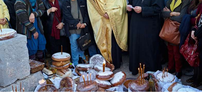 After the liturgy, the pilgrims share the semi-sweet bread and taste the “polyspori”, the offering to the Virgin Mary. The communities of Elefsina, but also many people from the neighboring villages or from other distant areas, who know the custom, gather every year to light a candle for the Virgin Mary. They cross the Megala Propylaea, the Callichoron Frear [the well] on the left, the Mikra Propylaea, the Ploutoneion on the right and the Agelastos Petra [the Mourning Rock]. The last section of the Iera Odos [Ancient Sacred Way] rises steeply. The baskets are placed directly on the ground in front of the chapel. At the entrance there is a candelabrum where the pilgrims can light their candles. After all, it is a very small church.